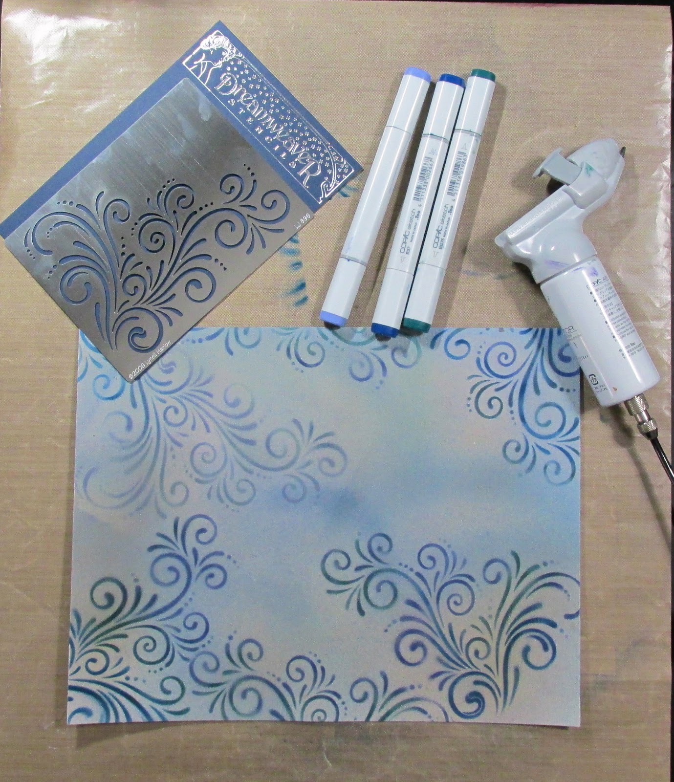 Airbrush flourish with coordinating colors. I went 2 shades lighter that the spritz colors. I used Dreamweavers Stencil, #LJ 896 Large Flourish. Spritz again all over with E59 to tone down and blend flourish in a little.